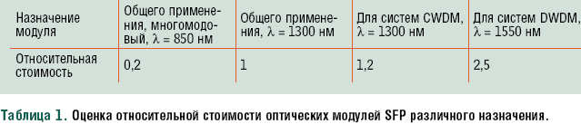 Таблица 1. Оценка относительной стоимости оптических модулей SFP различного назначения.