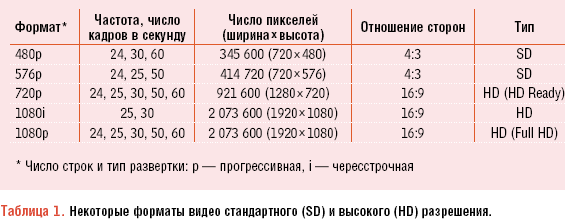 Таблица 1. Некоторые форматы видео стандартного (SD) и высокого (HD) разрешения.