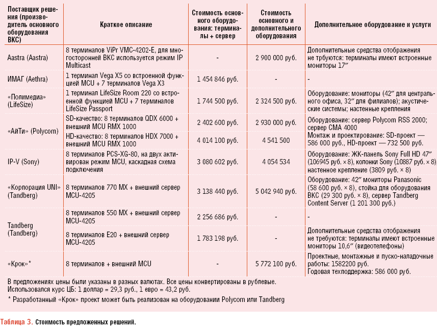 Большинство компаний предоставили данные по стоимости основного оборудования проекта, к которому относятся видеотерминалы с функционалом, необходимым для проведения презентации, и сервер MCU (см. Таблицу 3). «Инфосистемы Джет», «Корпорация UNI», «Ландата» предложили абсолютно одинаковый состав оборудования, однако в таблицу включена только одна компания — «Корпорация UNI», поскольку она указала еще и стоимость дополнительных компонент, в том числе мониторов и сервера Tandberg Content Server. Помимо цены оборудования, компании «АйТи» и «Крок» привели расценки на проектные и монтажные работы, а последняя включила в смету еще и услуги технической поддержки.