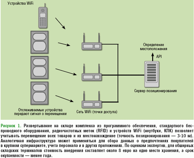 Рисунок 1. Развертывание на складе комплекса из программного обеспечения, стандартного беспроводного оборудования, радиочастотных меток (RFID) и устройств WiFi (ноутбуки, КПК) позволяет учитывать перемещение всех товаров и их местонахождение (точность позиционирования — 3-10 м). Аналогичная инфраструктура может применяться для сбора данных о предпочтениях покупателей в крупном супермаркете, учета персонала и в других приложениях. По оценкам экспертов, для обширных складских терминалов стоимость внедрения составляет около 8 евро на одно место хранения, а срок окупаемости — менее года.
