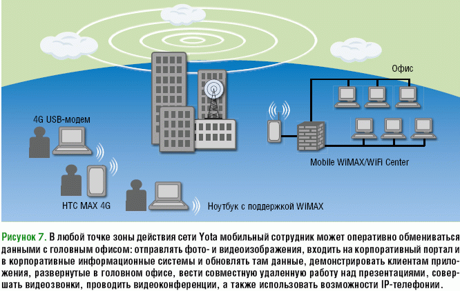 Рисунок 7. В любой точке зоны действия сети Yota мобильный сотрудник может оперативно обмениваться данными с головным офисом: отправлять фото- и видеоизображения, входить на корпоративный портал и в корпоративные информационные системы и обновлять там данные, демонстрировать клиентам приложения, развернутые в головном офисе, вести совместную удаленную работу над презентациями, совершать видеозвонки, проводить видеоконференции, а также использовать возможности IP-телефонии