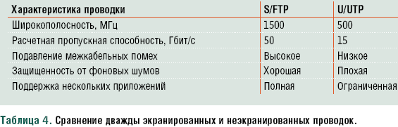 Двойное экранирование кабелей из витых пар значительно расширяет частотную полосу и снижает уровень помех в линии. Параметры широкополосности, пропускной способности, защищенности от межкабельных помех, электромагнитной совместимости и защиты от фоновых шумов, возможность передачи нескольких приложений показаны в Таблице 4, где дается сравнение с неэкранированной проводкой.
