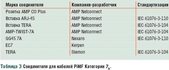 Таблица 3 Соединители для кабелей PiMF Категории 7А.