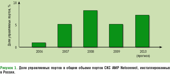 доля управляемых портов в общем объеме инсталлированных портов СКС AMP Netconnect в России составит 7% (см. Рисунок 1). В денежном выражении их вклад будет еще больше, поскольку СИУ строится на базе более дорогих коммутационных компонентов и включает дополнительное оборудование и ПО.