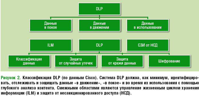 Рисунок 2. Классификация DLP (по данным Cisco). Система DLP должна, как минимум, идентифицировать, отслеживать и защищать данные «в движении», «в покое» и во время их использования с помощью глубокого анализа контента. Смежными областями являются управление жизненным циклом хранения информации (ILM) и защита от несанкционированного доступа (НСД).