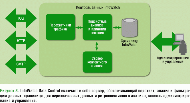 Рисунок 5. InfoWatch Data Control включает в себя сервер, обеспечивающий перехват, анализ и фильтрацию данных, хранилище для перехваченных данных и ретроспективного анализа, консоль администрирования и управления.
