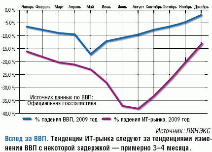 Сравнивая объем продаж на ИТ-рынке с уровнем ВВП страны, Сергей Карелов пришел к следующему выводу: тенденции ИТ-рынка следуют за тенденциями изменения ВВП с некоторой задержкой — примерно в 3–4 месяца. Так, если максимальное снижение ВВП наблюдалось в мае 2009 года, то «дно» ИТ-рынка пришлось на июль-август. Подобная корреляция наблюдается и для первых производных соответствующих показателей, т. е. темпов изменений. По словам эксперта, если бы темпы прироста IV квартала сохранились на протяжении всего 2010 года, то можно было бы ожидать общего увеличения рынка ИТ на 75%, но это маловероятно. Он считает, что импульс роста, который дало восстановление экономики, уже на исходе и позволит рынку более-менее стабильно чувствовать себя до конца весны. Затем возможны серьезные изменения, их характер в большей степени будет зависеть от внешних макроэкономических показателей, в первую очередь от ситуации в США.