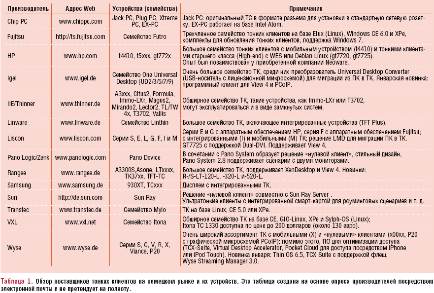 Таблица 1. Обзор поставщиков тонких клиентов на немецком рынке и их устройств. Эта таблица создана на основе опроса производителей посредством электронной почты и не претендует на полноту.