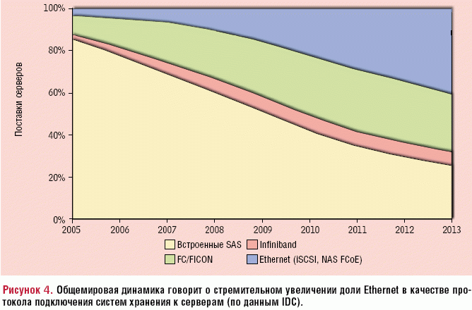 Благодаря появлению высопроизводительных интерфейсов 10 Гбит/с повсеместно создаются сети хранения данных (SAN) на базе протокола iSCSI — соответствующее оборудование дешевле Fibre Channel и упрощает развертывание SAN. В прошлом году продажи систем iSCSI SAN на мировом рынке выросли почти на 25%. С разработкой технологии Fibre Channel over Ethernet (FCoE) началась миграция систем FC в сети Ethernet в расчете на снижение стоимости и упрощение обслуживания технических решений. В новых проектах специалисты все чаще будут обращаться к решениям iSCSI и FCoE, которые в конечном счете позволят перевести системы хранения на Ethernet (см. Рисунок 4).