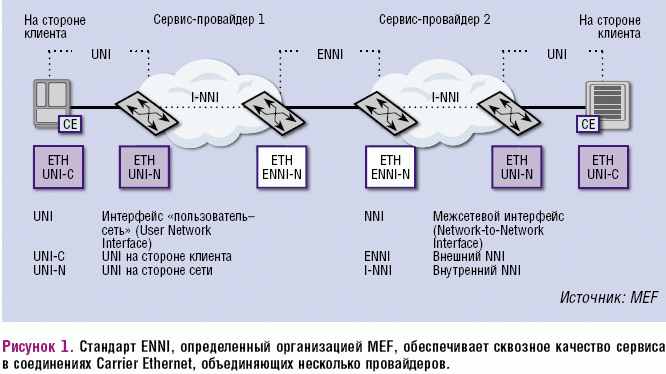 В январе 2010 года была наконец-то подготовлена долгожданная спецификация MEF26, где формулируется первая фаза внешнего межсетевого интерфейса (External Network-to-Network-Interface, ENNI). Межсетевой интерфейс (Network-to-Network-Interface, NNI) определяет интерфейсы и взаимодействие между двумя сетями. ENNI распространяет их на подключение внешней сети (см. Рисунок 1). Последняя, как правило, находится под юрисдикцией другого сервис-провайдера или является собственной сетью оператора, расположенной в другом регионе.