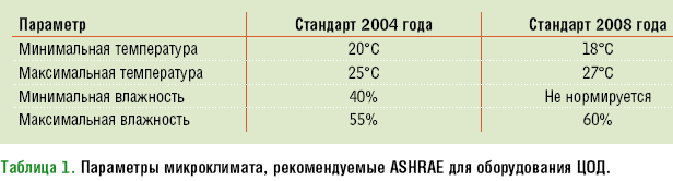 Выбор температуры охлаждающего воздуха на входе в серверы — одна из наиболее остро обсуждаемых сейчас тем (понятно, чем она выше, тем в большей мере можно использовать естественное охлаждение). Если в своем стандарте 2004 года организация ASHRAE (Aмериканское сообщество инженеров по обогреву, охлаждению и кондиционированию воздуха) не рекомендовала, чтобы эта температура превышала 25°C, то в новом стандарте, выпущенном в 2008 году, планка поднята до 27°С (см. Таблица 1). Широко известная высокой энергоэффективностью своих ЦОД компания Google поддерживает температуру на входе серверов в пределах 26–27°С.