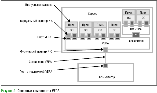 Для преодоления ограничений встроенных программных коммутаторов предлагается немало способов. Один из них — использование технологии Virtual Ethernet Port Aggregator (VEPA), о поддержке которой заявили компании Brocade, Enterasys, Extreme Networks, HP, Juniper Networks и др. (см. Рисунок 2).