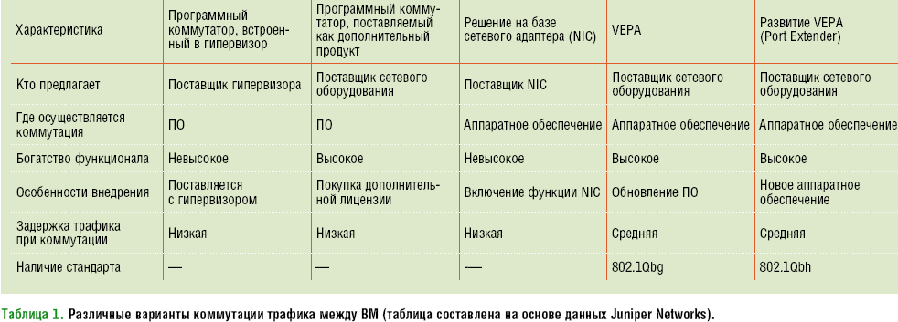 Таблица 1. Различные варианты коммутации трафика между ВМ (таблица составлена на основе данных Juniper Networks).