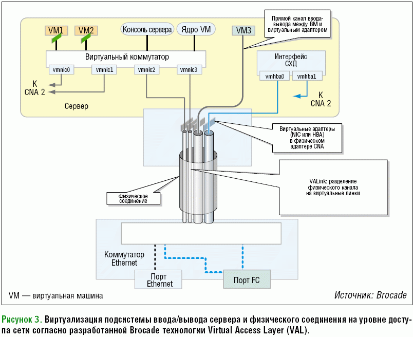 Разработанная Brocade технология Virtual Access Layer (VAL) виртуализирует подсистему ввода/вывода сервера и физические соединения на уровне доступа к сети (см. Рисунок 3). При этом виртуальное соединение VALink может быть ассоциировано с виртуальным адаптером (NIC или HBA), созданным на физическом адаптере CNA. Такое соединение, между адаптером CNA и ближайшим коммутатором, логически изолировано и привязано к конкретной виртуальной машине (или некоторому классу ВМ). При этом можно продолжить использование программного коммутатора на базе гипервизора (через такой коммутатор проходят соединения от ВМ1 и ВМ2, см. Рисунок 3), а можно функции ввода/вывода реализовать напрямую между ВМ и виртуальным адаптером (ВМ3 на Рисунке 3). При переезде ВМ на другой физический сервер ее ассоциация с VALink сохраняется, что позволяет поддерживать приписанные к ней настройки сетевых параметров и безопасности.