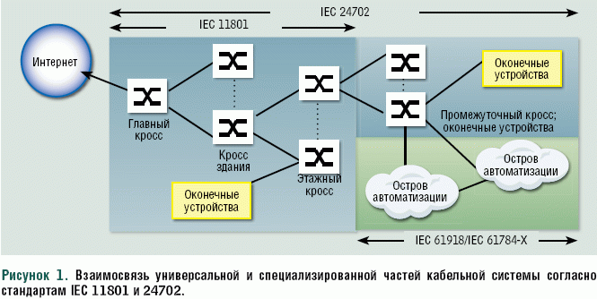 Продвижением и развитием систем на базе Ethernet занимается множество организаций. Предлагаемые решения варьируются от адаптации структурированных кабельных систем офисного назначения для применения на промышленных предприятиях до применения специальных компонентов и топологий по аналогии с широко распространенными полевыми шинами. В этой связи достойны отдельного упоминания несколько стандартов Международной электротехнической комиссии (International Electrotechnical Commission, IEC). Общая структура кабельной системы предприятия описана в стандарте IEC 11801/24702. Требования в отношении той части кабельной системы, которая обслуживает непосредственно область производства, содержатся в стандарте IEC 61918 (см. Рисунок 1).