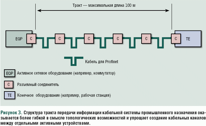 Общая протяженность тракта передачи может достигать 100 м при произвольной комбинации разрешенных типов кабелей. Разъемные соединители в тракте, согласно условиям эксплуатации в производственной зоне, могут выполняться в форме проходных адаптеров, муфт и традиционных розеток. Модель тракта передачи предусматривает применение электропроводных кабелей с жилами поперечного сечения 22 AWG и соответствующего им коммутационного оборудования, благодаря чему упрощается планирование сети. Особым преимуществом обладает такое соединительное оборудование, которое допускает быструю установку на кабели без применения специализированного инструмента.
