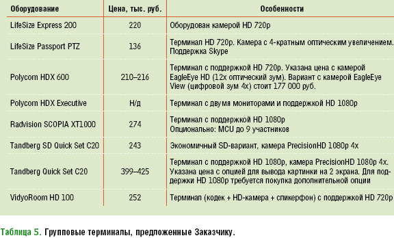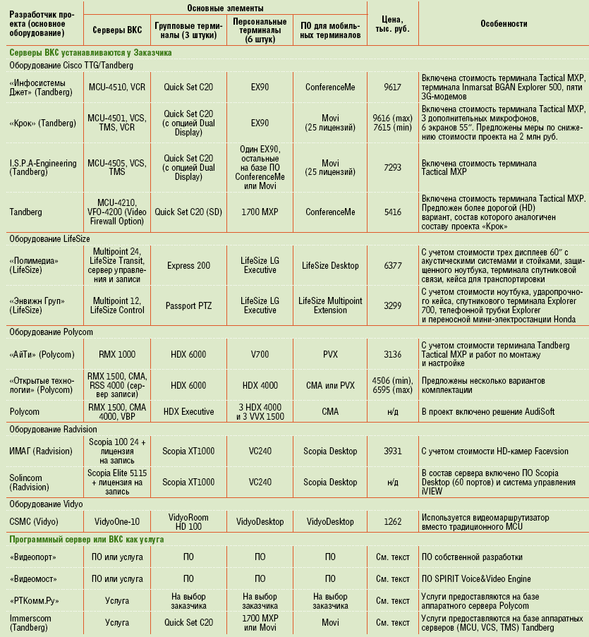 Основная часть присланных нам проектов предусматривает установку серверов MCU и терминалов известных производителей: Tandberg (теперь это подразделение Cisco Telepresence Technology Group), Polycom, Radvision, LifeSize. Решение с использованием инновационной технологии видеомаршрутизаторов Vidyo разработано компанией CSMС, арендовать ресурсы серверов ВКС предложили Immerscom и «РТКомм.Ру», а проекты на основе программных решений представили «Видеопорт» и «Видеомост» (см. Таблица 1). Поскольку цены на продукты и услуги указывались в разной валюте, для удобства анализа мы сделали перерасчет с учетом рублевого эквивалента, для чего курс доллара приняли равным 30, а евро — 38 рублям.
