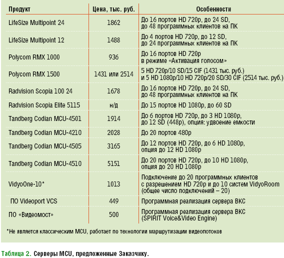 Таблица 2. Серверы MCU, предложенные Заказчику.
