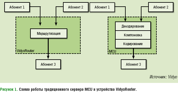 Рисунок 1. Схема работы традиционного сервера MCU и устройства VidyoRouter.