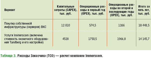 Таблица 3. Расходы Заказчика (TCO) — расчет компании Immerscom.