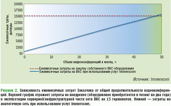 При расчете предполагалось предоставление каждому из 15 абонентов услуг по проведению 12 многоточечных конференций в месяц, каждая из которых будет продолжаться в течение 1 часа (ресурсы MCU), а также внутренней видеосвязи «точка – точка» общей продолжительностью 1000 мин в месяц (ресурсы VCS). Кроме того, в сервис включены услуги по подключению к сеансам ВКС телефонных абонентов и записи конференций — все это обойдется Заказчику в 1 692 тыс. руб. в год. Поскольку стоимость услуг Immerscom зависит от общей продолжительности конференций, Заказчик попросил компанию сравнить стоимость обоих вариантов и с учетом этого параметра, что и было оперативно сделано (см. Рисунок 2).