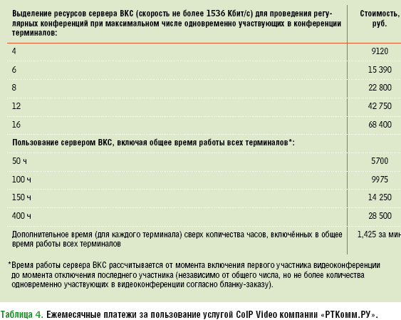 Таблица 4. Ежемесячные платежи за пользование услугой CoIP Video компании «РТКомм.РУ».