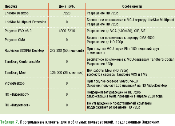 Таблица 7. Программные клиенты для мобильных пользователей, предложенные Заказчику.