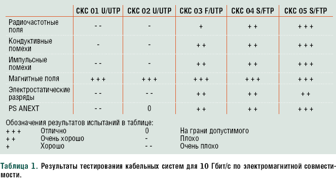 В итоге проверку прошли пять кабельных систем (первая система U/UTP — СКС 00 — не выдержала отборочных испытаний). Результаты тестирования остальных (от СКС 01 до СКС 05), представленные в Таблице 1, свидетельствуют о том, что по показателю электромагнитной совместимости неэкранированные кабельные системы непригодны для 10 Gigabit Ethernet.