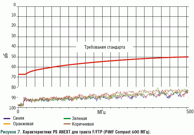 Результаты измерений PS ANEXT показаны на Рисунке 7, из которого видно, что испытанные тракты намного превосходят требования, предъявляемые стандартом ISO/IEC 11801:2002 с Поправкой 1. Следовательно, представленные тракты не требуют испытаний межтрактовых переходных помех в полевых условиях, что является их важным преимуществом перед неэкранированными.