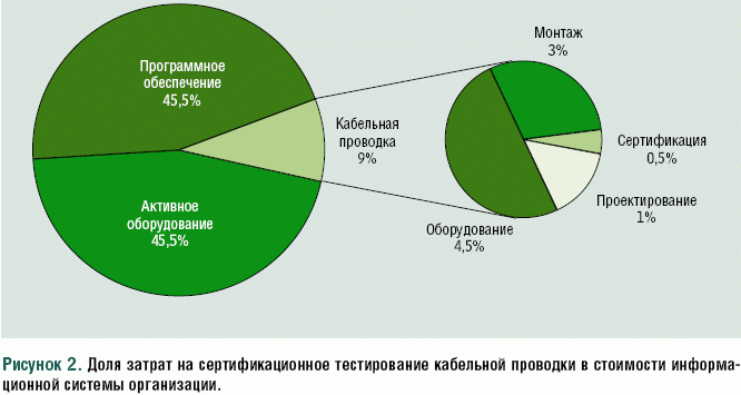 Таким образом, получается, что в общей стоимости информационной системы предприятия доля кабельной проводки не превышает 10%, а стоимость ее тестирования составляет менее 0,5% от общей суммы расходов (см. Рисунок 2). Между тем от этой относительно малой суммы напрямую зависит эффективность работы информационной системы. Объяснение очень простое: именно качество реализации кабельной проводки определяет уровень ошибок при передаче сигналов разнообразных информационных приложений.