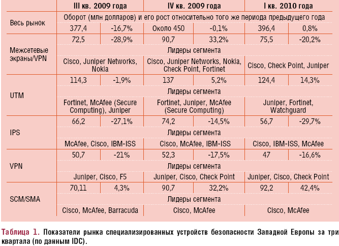 В текущем году, обещает IDС, в Европе данный сегмент полностью восстановит высокие темпы роста, которые в 2008 году превысили 14%. В I квартале 2010 года его оборот уже почти достиг 400 млн долларов (см. Таблицу 1). В единицах продукции поставки выросли на 1,3% — примерно 133 тыс. устройств. На продукцию «первой пятерки» (Cisco, McAfee, Juniper, Fortinet и Check Point) приходится около половины рынка (в денежном выражении).