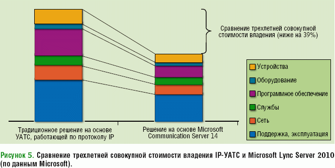 Рисунок 5. Сравнение трехлетней совокупной стоимости владения IP-УАТС и Microsoft Lync Server 2010 (по данным Microsoft).