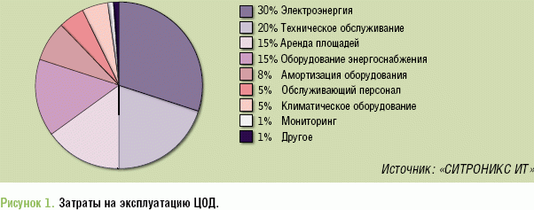 Счет за электроэнергию составляет едва ли не главную статью затрат на содержание ЦОД (см. Рисунок 1). Именно поэтому вопрос эффективного использования имеющихся энергоресурсов с целью оптимизации эксплуатационных расходов не теряет актуальности. Для снижения издержек в работе серверного оборудования применяются такие подходы в ИТ, как «консолидация» и «виртуализация». Однако в этой статье мы остановимся на методах повышения эффективности работы инженерной инфраструктуры ЦОД.