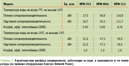 Таблица 1. Характеристики шкафных кондиционеров, работающих на воде, в зависимости от ее температуры (на примере оборудования Emerson Network Power).