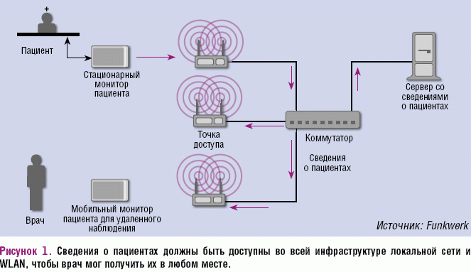 В настоящее время больницы, обладающие современным оборудованием, проявляют большой интерес к инфраструктурам WLAN и рассматривают их в качестве дополнения к своим проводным локальным сетям. Как правило, технология WLAN требуется для осуществления так называемых мобильных посещений или предоставления пациентам прямого доступа в Интернет. Производители современного медицинского оборудования пошли еще дальше: они используют инфраструктуру WLAN для того, чтобы все врачи могли в любое время получить информацию о состоянии здоровья своих пациентов (к примеру, данные о частоте сердцебиения или пульса) (см. Рисунок 1).