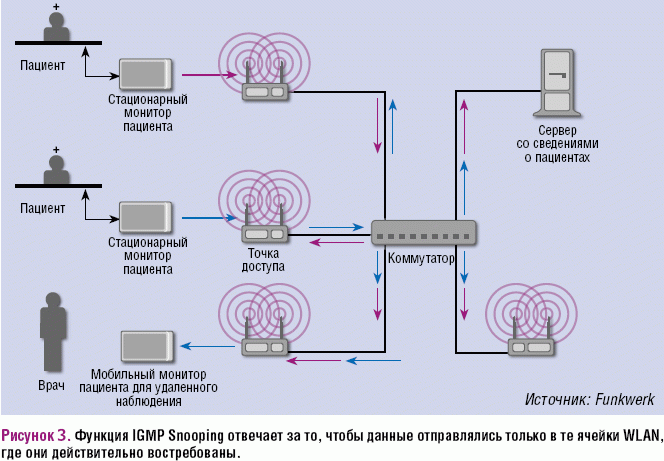 В таких случаях на помощь приходит функция IGMP Snooping. Как правило, эта возможность имеется только в точках доступа профессиональных серий (к примеру, в модели Bintec W1002n компании Funkwerk Enterprise Communications, которая к тому же разрешена для использования в медицинских учреждениях). Такая категория точек доступа наилучшим образом подходит для создания инфраструктуры, позволяющей наблюдать за состоянием пациентов, и гарантирует бесперебойную передачу данных по всей больнице.