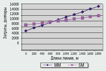 | Рисунок 2. Влияние протяженности оптической линии СКС на затраты по ее реализации в случае применения многомодовой (mm) и одномодовой (sm) элементной базы. |