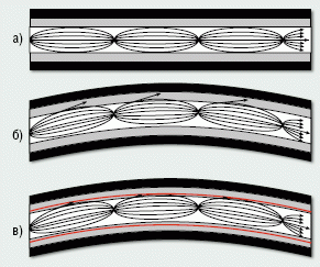 | Рисунок 4. Прохождение лучей отдельных мод в волоконном световоде: а) прямом градиентном; б) изогнутом градиентном; в) изогнутом градиентном изгибостойком. |