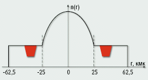 | Рисунок 5. Профиль показателя преломления изгибостойкого градиентного волоконного световода (заливкой красным цветом обозначены области структурирования оболочки, подавляющие эффект возникновения мод утечки). |
