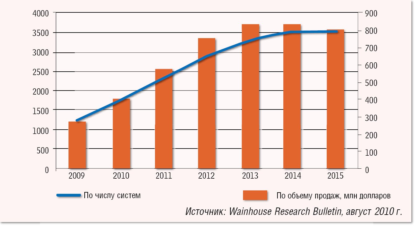 Если говорить об исследованиях рынка ВКС, проводимых наиболее авторитетной в этой области организацией — Wainhouse Research, то в них вообще системы телеприсутствия специально не выделяются, зато особую группу составляют системы с несколькими кодеками. Примерами таких систем являются продукты T3 и CTS 3000 компании Cisco (первый из названных — разработка Tandberg), OTX компании Polycom, Halo Collaboration Suite компании HP. Надо сказать, аналитики не слишком оптимистичны в отношении их перспектив: согласно прогнозу Wainhouse Research, рост продаж групповых систем ВКС с несколькими кодеками будет продолжаться еще пару лет, затем кривая продаж стабилизируется на достигнутом уровне, и в 2015 году будет наблюдаться даже некоторый спад (см. Рисунок 1).