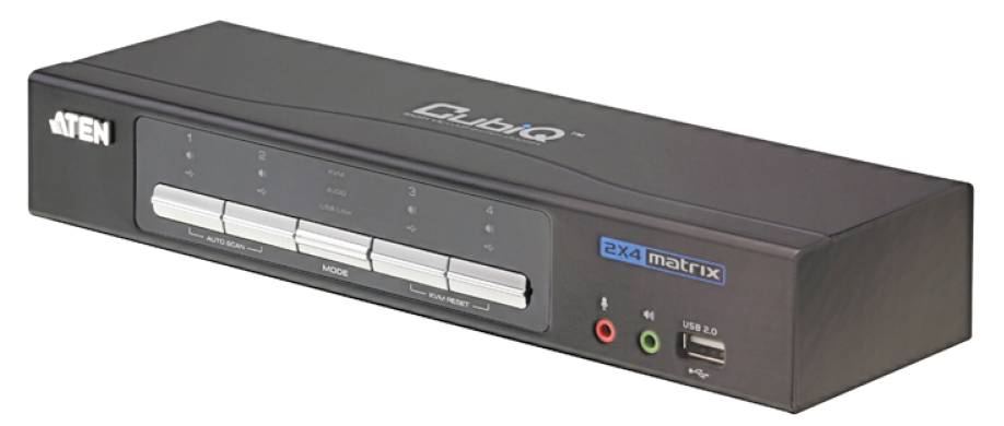Матричный KVMP-переключатель ATEN CM0264 позволяет управлять четырьмя компьютерами с одной консоли, состоящей из USB-клавиатуры, USB-мыши и двух мониторов — HDMI и DVI. Одна двухмониторная USB-консоль способна одновременно контролировать два компьютера с DVI, два компьютера или устройства с HDMI и два дополнительных USB-устройства.