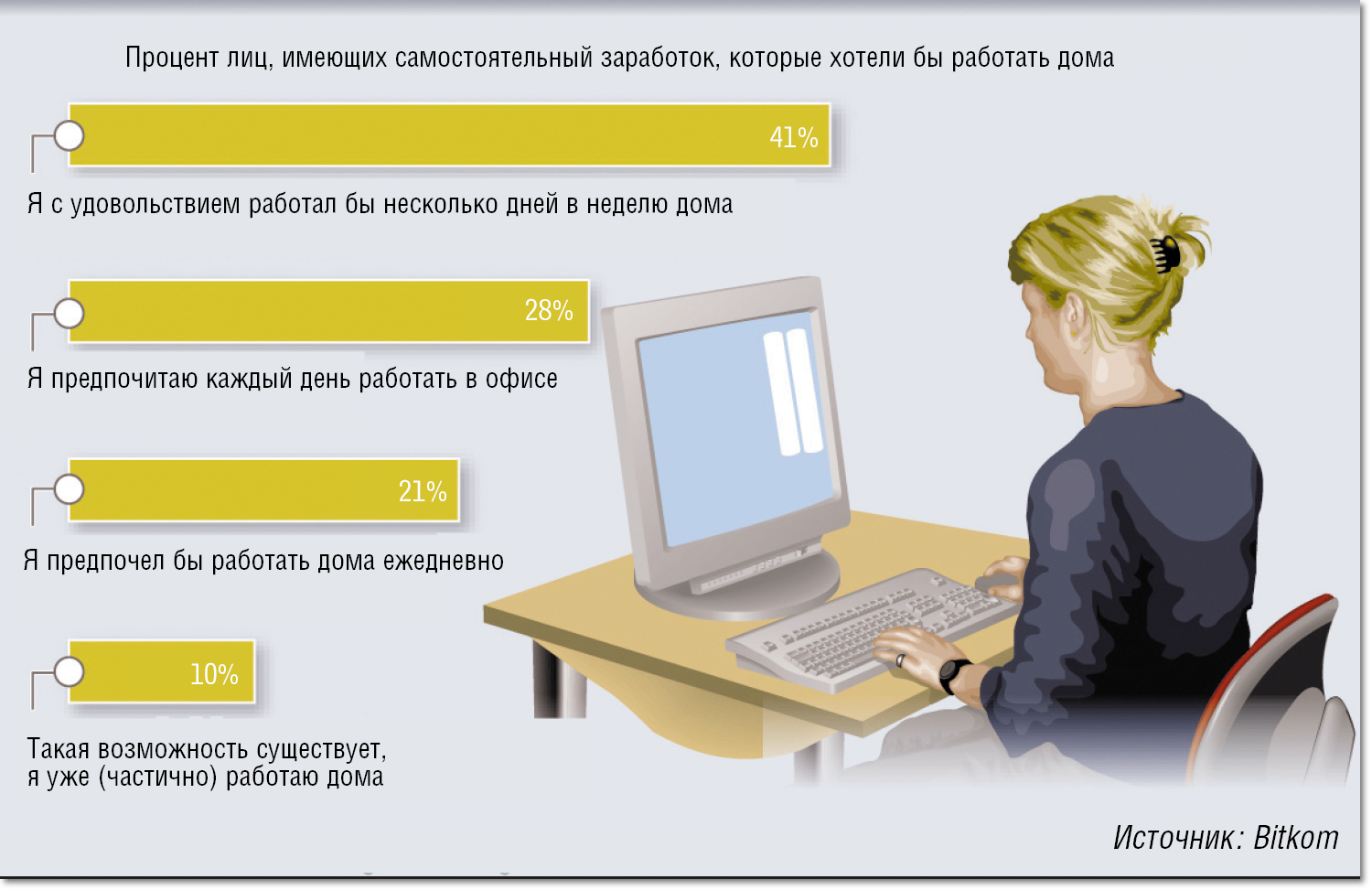 | Рисунок 1. Почти три четверти немецких работников предпочли бы иметь более гибкие условия работы или уже регулярно работают на дому. |