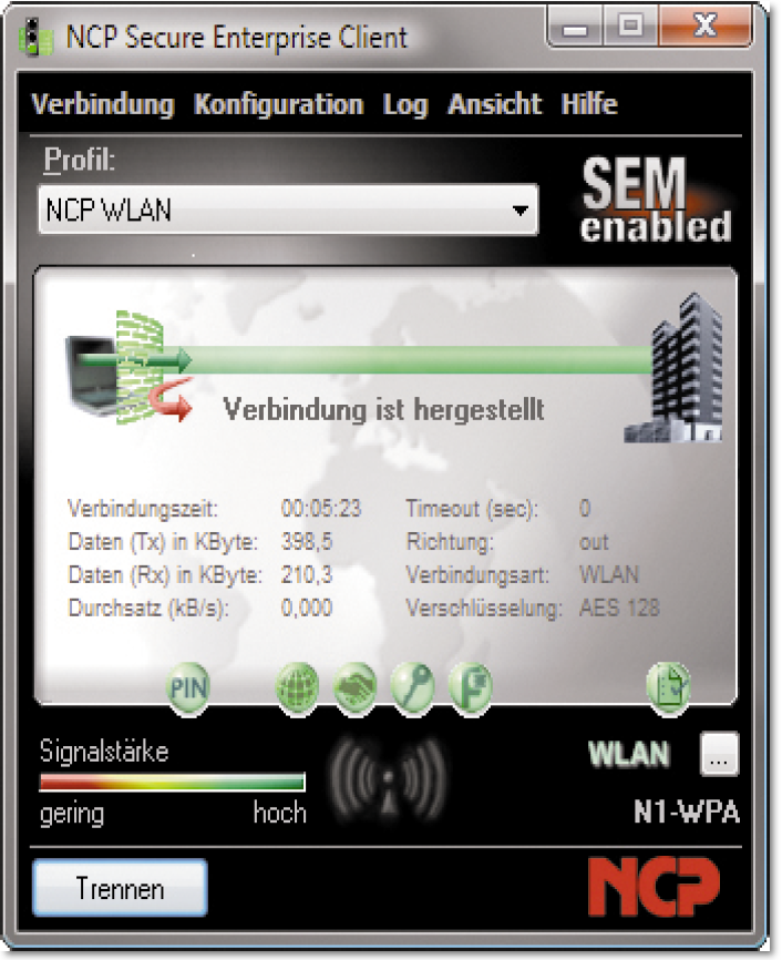 | Рисунок 2. Пользовательский интерфейс клиента от NCP для корпоративного использования идентичен для всех операционных систем и предоставляет пользователям обзор всех важных параметров. |