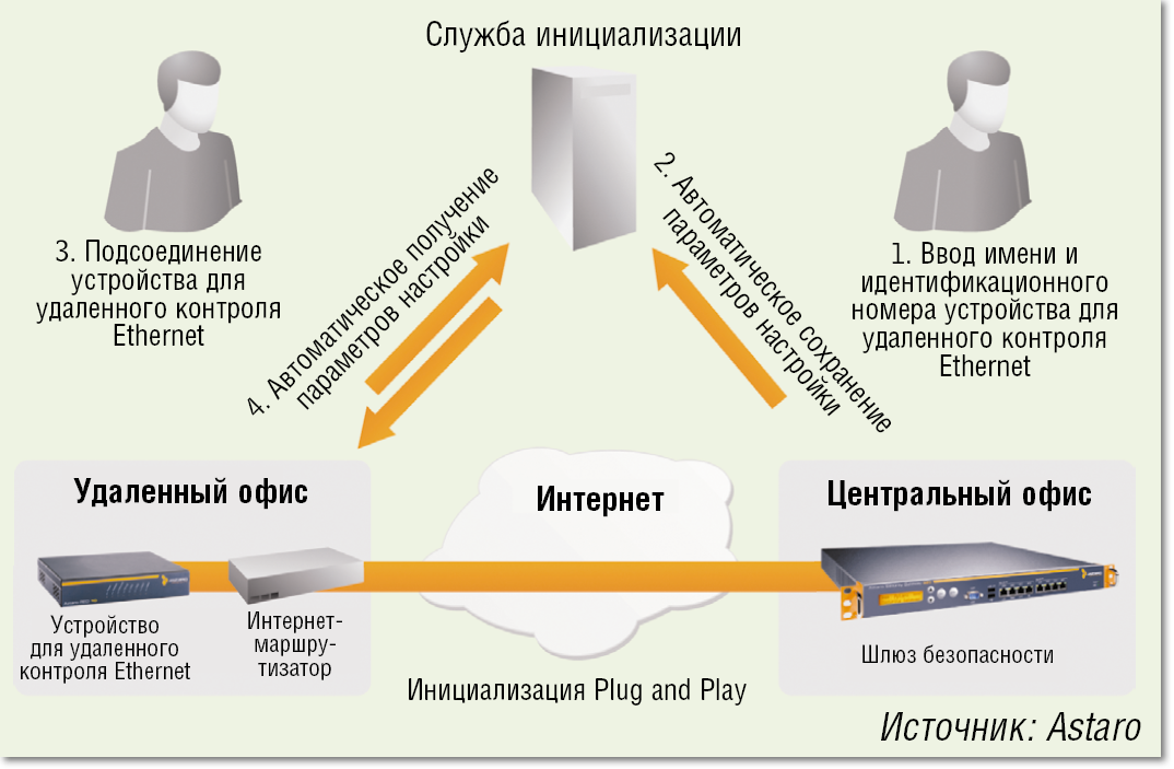 Сотрудник филиала должен распаковать устройство, сообщить его серийный номер в отдел ИТ центрального офиса, а затем подключить к интернет-маршрутизатору, компьютеру или коммутатору и розетке. Больше никаких специальных технических навыков от него не требуется. Отдел ИТ вводит идентификационный номер устройства и имя филиала на централизованном шлюзе безопасности, после чего автоматически создаются параметры конфигурации, отправляемые на центральный сервер инициализации (Provisioning Server). При включении устройство получает от локального маршрутизатора свой IP-адрес и создает соединение SSL с центральным сервером инициализации. Если на маршрутизаторе используется фильтр пакетов, то порт 3400 должен быть открыт.