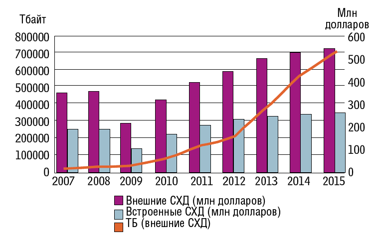 | Емкость для данных. Суммарная емкость внешних СХД, поставленных на российский рынок, составит почти 150 Пбайт. |