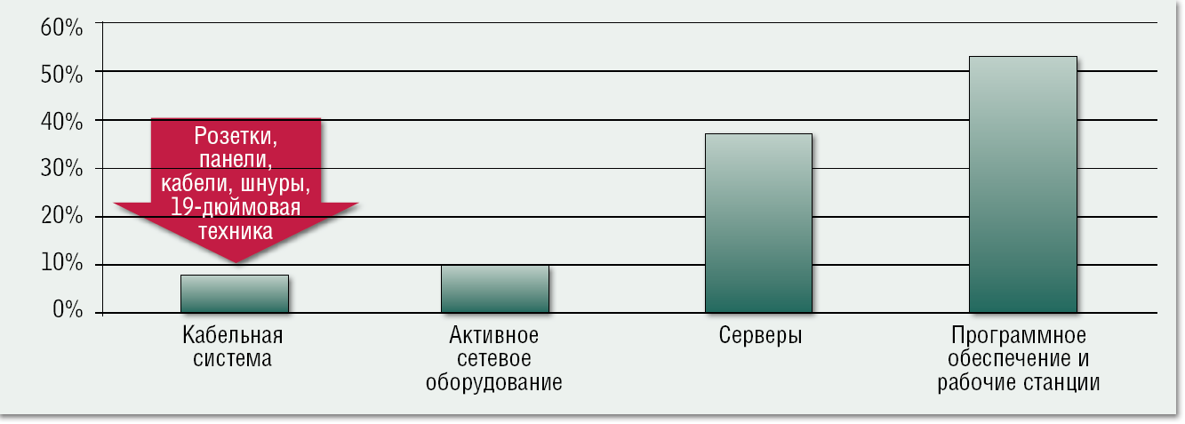 Кабели современной СКС, размещенные за подвесным потолком и проложенные в пространстве под фальшполом, образуют ту информационную магистраль, по которой передаются сигналы систем промышленной автоматизации, IP-телефонии и видео-конференц-связи. Общая стоимость компонентов СКС (линейные кабели, шнуры и коммутационное оборудование) едва ли превышает 10% общих затрат на ИТ-инфраструктуру (см. Рисунок 1).