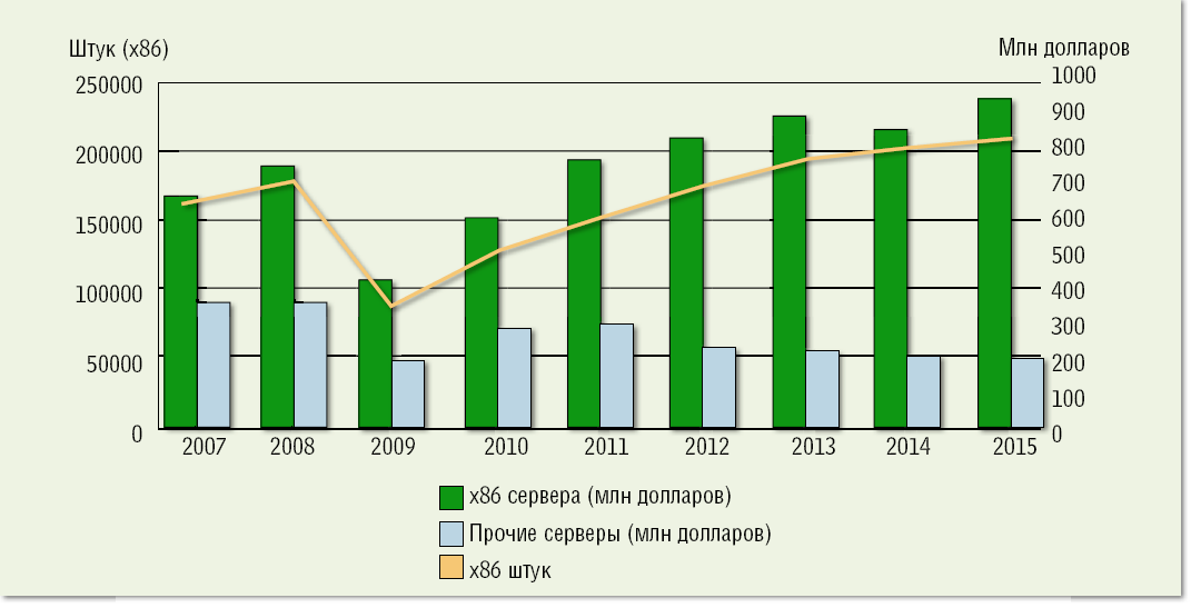 В прошлом году на мировом рынке продажи серверов продолжали расти, чему способствовали такие факторы, как замена систем x86, отложенная из-за глобальной рецессии, появление новых процессоров Intel и AMD. Однако аналитики Gartner считают, что это обновление уже миновало свой пик и в текущем году этот рост замедлится. На серверы платформы x86 приходится примерно 97% всех продаж в единицах продукции. По прогнозам IDC, на российском рынке серверов стандартной архитектуры выход на докризисные показатели 2008 года ожидается в текущем году (см. Рисунок 1), однако рынок серверов платформы CISC, RISC и EPIC уже не достигнет прежних высот.