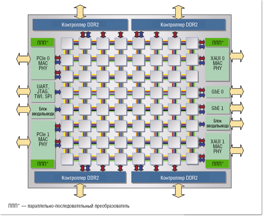 Рисунок 5. Процессор Tilera TilePro64 с 64 ядрами потребляет 50 Вт и по вычислительной мощности эквивалентен двум процессорам Intel Xeon 5500, потребляющим 250 Вт. Ядра процессора Tilera взаимодействуют с помощью технологии iMesh, позволяющей подавать поток данных сразу на два ядра.