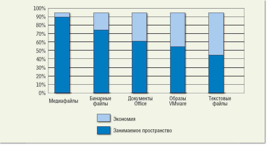 | Рисунок 5. Фоновое сжатие данных экономит примерно 50% пространства и может использоваться совместно с дедупликацией. |