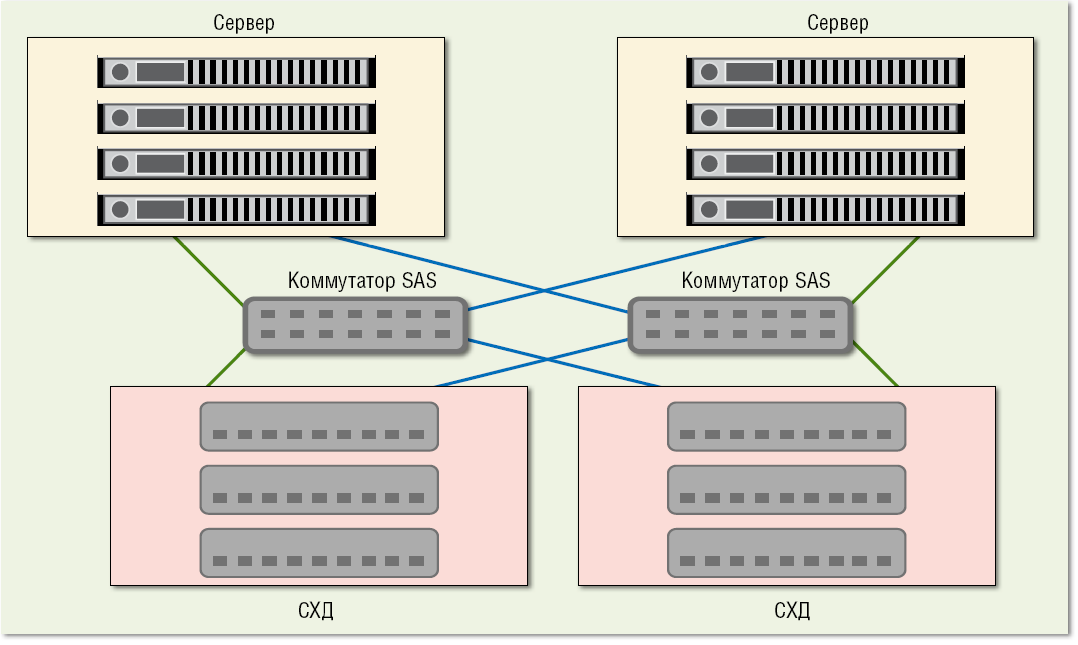 По мнению Дмитрия Носачева, инженера компании True System, в зависимости от требования к масштабируемости и надежности, в небольших ЦОД можно выгодно использовать разные схемы подключения СХД SAS с одним или двумя контроллерами. Например, с помощью двух коммутаторов LSI 6160 построить отказоустойчивую конфигурацию с системами хранения (см. Рисунок 6). В небольших ЦОД коммутатор SAS способен стать недорогой альтернативой Fibre Channel при подключении систем JBOD (с поддержкой зонирования отдельных дисков), RBOD и ленточных библиотек.